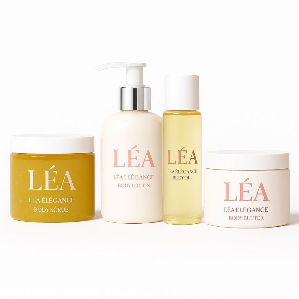 مجموعة LÉA ÉLÉGANCE تجربة فاخرة تجمع بين النعومة والأنوثة، تتكوّن من: مقشر، زبدة، زيت، وكريم للجسم. لأن الجمال يبدأ من التفاصيل